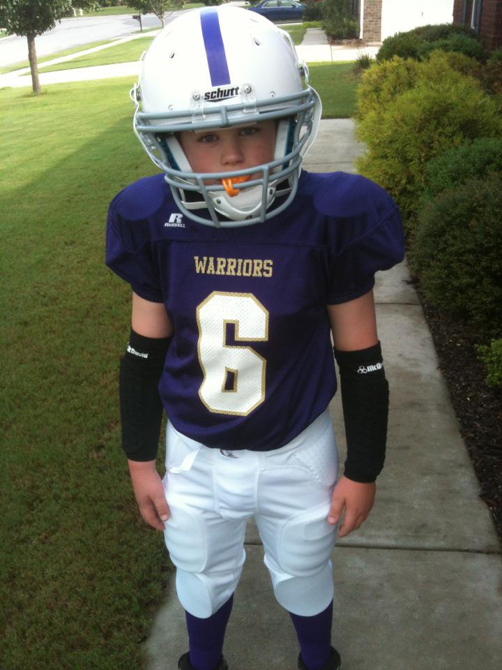 Daniel is tough as nails and a fierce competitor (something about having an older brother I’m told).  He is extremely independent and a hard worker.  As a matter of fact, it offends him if you ask about his homework.  He just does it and does it extremely well!  He will work for hours at a time to improve in whatever sport he is playing.  Speaking of sports, I do not believe I have ever seen a child that loves sports more than Daniel does.  If he has an idle minute, he will be out the door and bouncing a ball in a matter of seconds!  The picture above is Daniel just before his first football game this season. He also plays basketball and baseball.